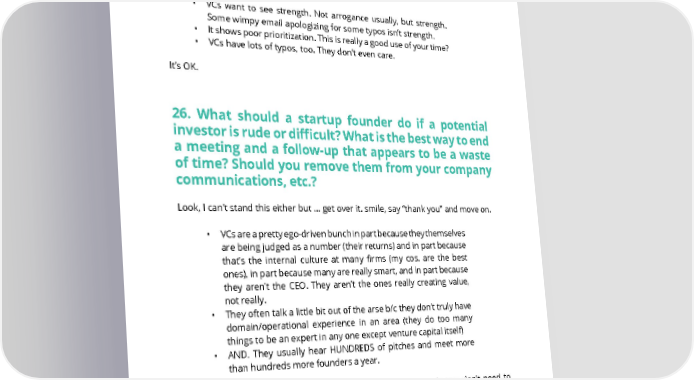 25. I just sent an email to a VC with two typos. Should I resend the email? No, no, no and no. • VCs want to see strength. Not arrogance usually, but strength. Some wimpy email apologizing for some typos isn’t strength. • It shows poor prioritization. This is really a good use of your time? • VCs have lots of typos, too. They don’t even care. It’s OK. 26. What should a startup founder do if a potential investor is rude or difficult? What is the best way to end a meeting and a follow-up that appears to be a waste of time? Should you remove them from your company communications, etc.? Look, I can’t stand this either but ... get over it. smile, say “thank you” and move on. • VCs are a pretty ego-driven bunch in part because they themselves are being judged as a number (their returns) and in part because that’s the internal culture at many firms (my cos. are the best ones), in part because many are really smart, and in part because they aren’t the CEO. They aren’t the ones really creating value, not really. • They often talk a little bit out of the arse b/c they don’t truly have domain/operational experience in an area (they do too many things to be an expert in any one except venture capital itself) • AND. They usually hear HUNDREDS of pitches and meet more than hundreds more founders a year. There’s no excuse for being rude. Mom taught us that. While you don’t need to be sympathetic you need to understand that’s how VC are and thicken your skin. Thickening you skin, dealing with all different sorts of folks and doing what it takes to win -- that’s a big part of the job of CEO. And ... you may just need that guy for your Series C. You never know. SAASTR.COM 24