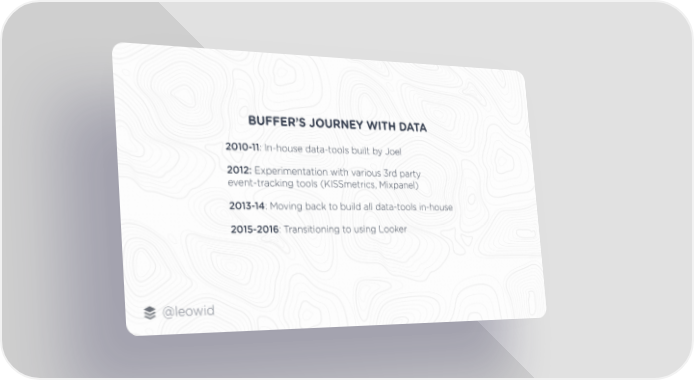 BUFFER’S JOURNEY WITH DATA 2010-11: In-house data-tools built by Joel 2012: Experimentation with various 3rd party event-tracking tools (KISSmetrics, Mixpanel) 2013-14: Moving back to build all data-tools in-house 2015-2016: Transitioning to using Looker @leowid